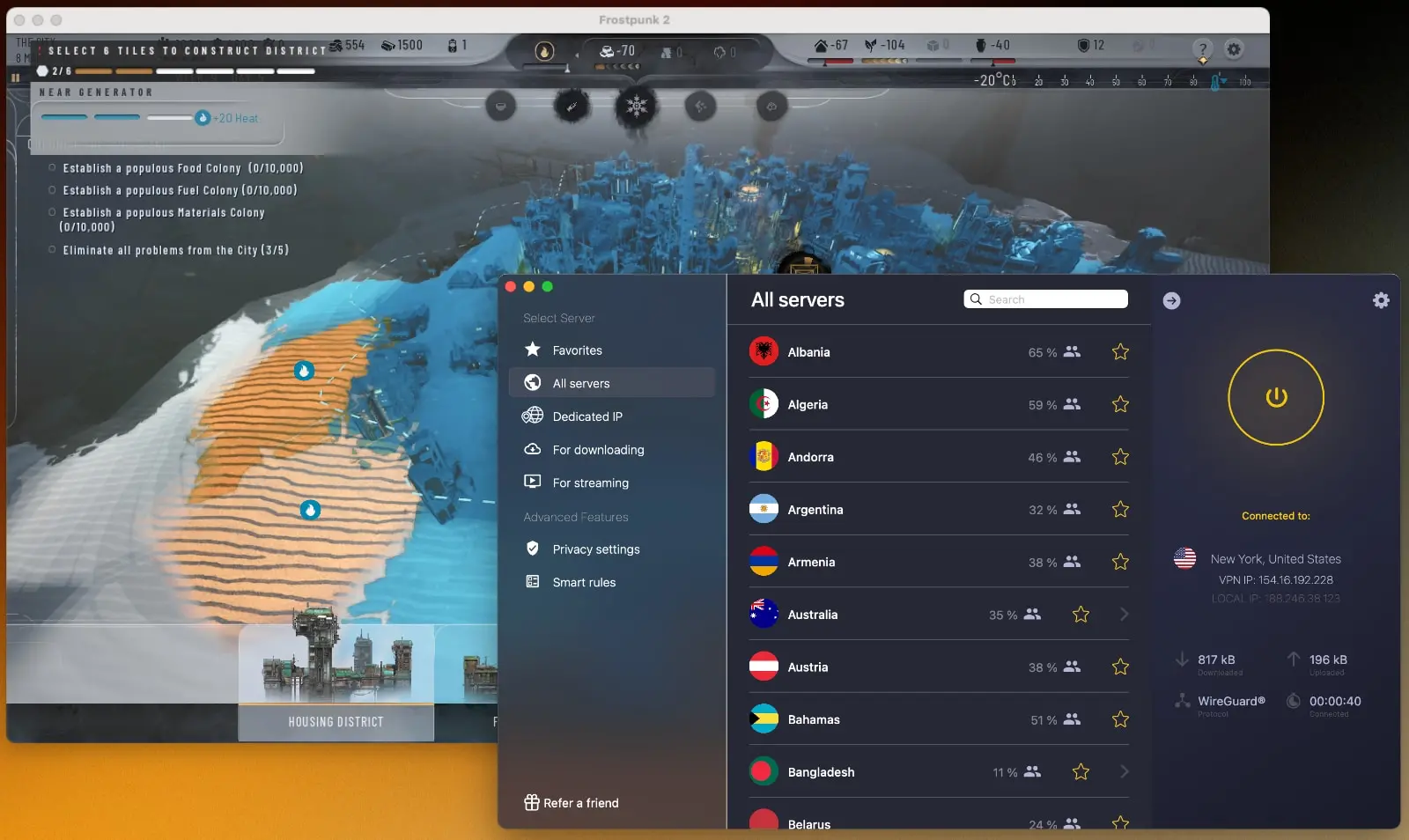 - Kill switch a split tunneling – takže si VPN pustíš třeba jen na hru a zbytek internetu běží bez VPNky.