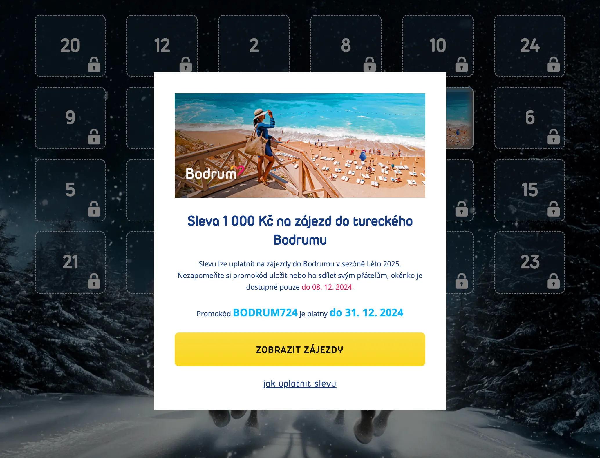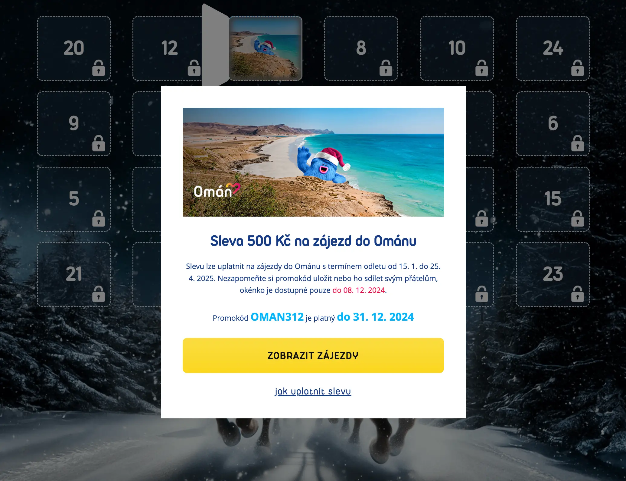 Je to jednoduché jako otvírání adventního okénka. Každý den v prosinci na vás čeká nový promokód se slevou. Stačí se podívat do kalendáře, najít aktuální den, zapsat si kód a začít plánovat vaši cestu. Platnost každého promokódu je vždy od zveřejnění až do 31. 12. 2024. Takže máte dost času si rozmyslet, kam vyrazíte!