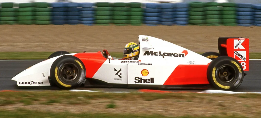 Ayrton Senna řídící svůj McLaren-Honda ve Formuli 1 během závodu, zachycený na okruhu, s jeho ikonickou žlutou helmou a červenobílým vozem.