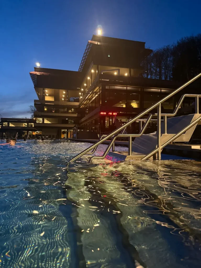 Abych byl fér – není to jen „obyčejný“ bazén. To je termální lázeňská nálož jak z reklamy. Voda se mění každý den, 100% vřídelní, žádná ředěná polévka. Teplota konstantních 38 °C celý rok. Takže ať je venku mráz nebo tropy, skočíte tam a připadáte si jako římský císař na dovolené. Bazén je dost velký, ale občas se tlačíte s ostatními zájezdy z Německa o místo. Nicméně ten výhled? Tohle má fakt atmosféru!!!