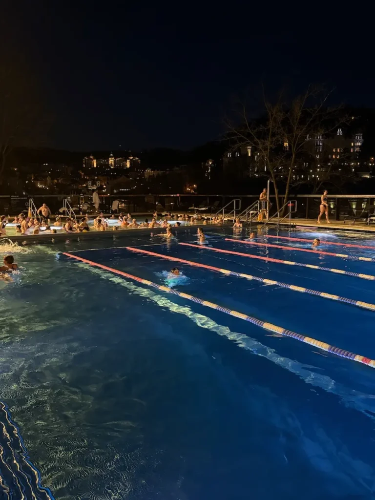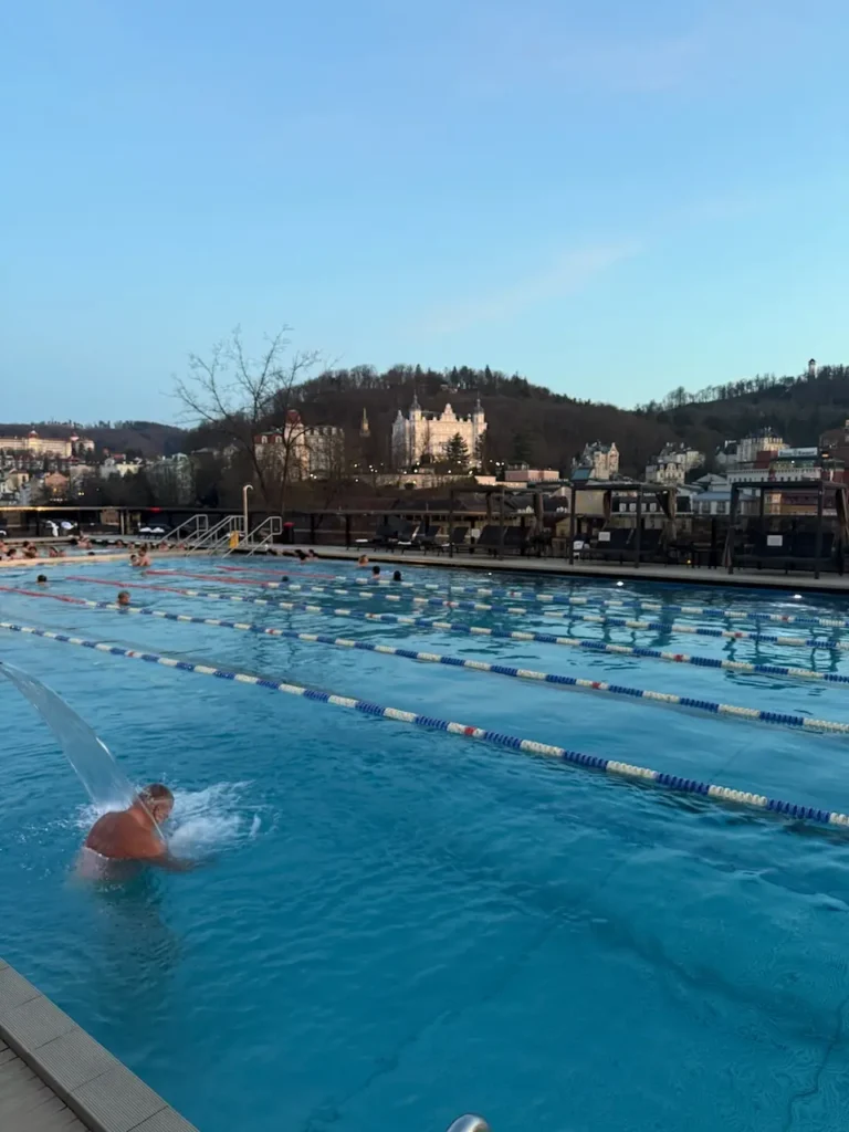 Tenhle bazén není jen o teplé vodě. Je to o tom, že ležíte ve 100% vřídelní vodě a koukáte na střechy lázeňských domů pod sebou. Ta kombinace horké vody a chladnějšího večerního vzduchu má fakt kouzlo. Děti z toho byly nadšené – i ty větší, co už normálně dělají „to je trapný“ skoro na všechno.