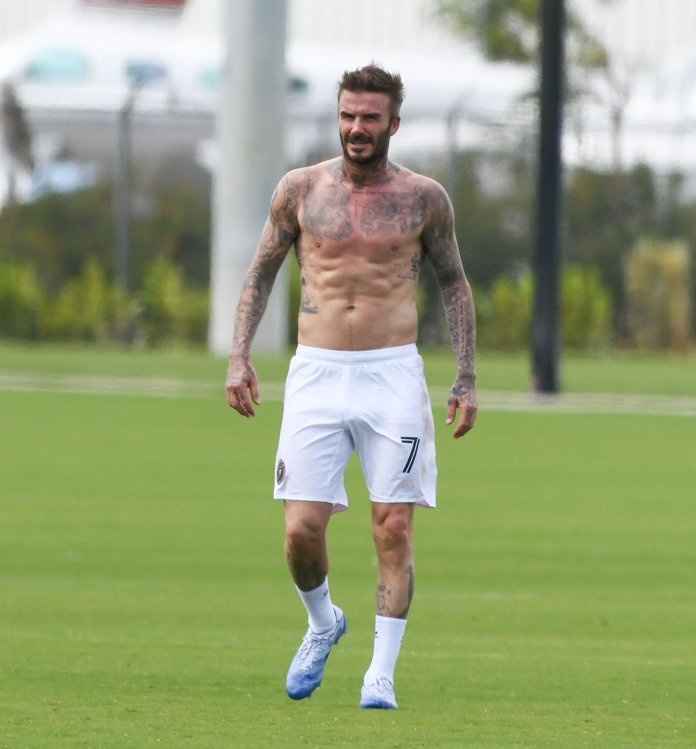 Bývalý fotbalista David Beckham běží po zeleném trávníku v bílých šortkách s číslem 7, odhalující svou atletickou postavu a rozsáhlé tetování.