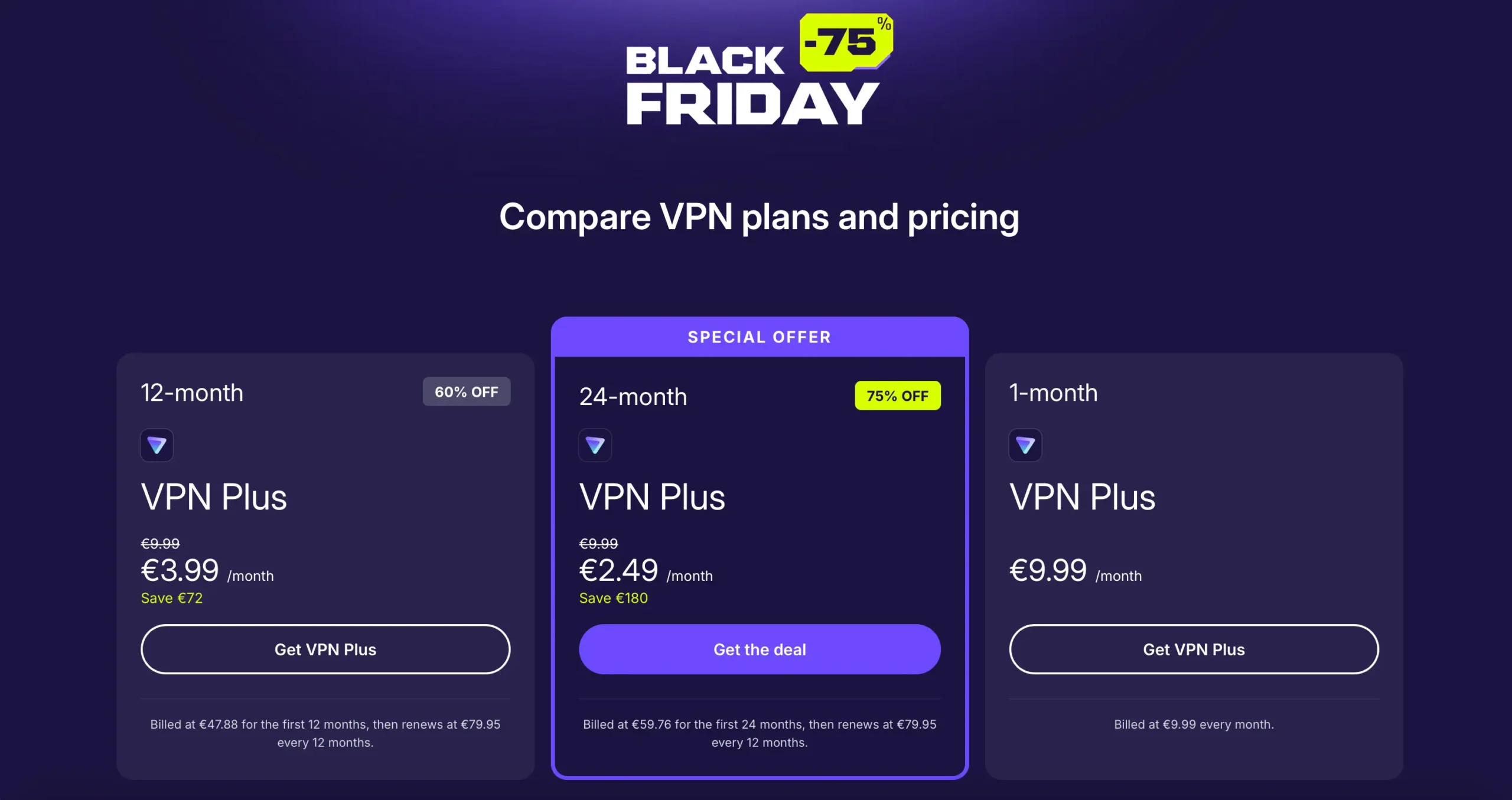 Než se ponoříme do toho, proč je ProtonVPN skvělá volba, pojďme si ukázat fakta. Na přiložených screenshotech vidíte standardní Black Friday nabídku ProtonVPN – 70% sleva, cena 2,99€ měsíčně. Vypadá to lákavě, že? Ale počkejte, až uvidíte, co jsme vyjednali my! Díky naší dlouhodobé spolupráci s týmem ProtonVPN jsme pro vás získali exkluzivní 75% slevu, což znamená cenu pouhých 2,49€ měsíčně (tj cca 62 Kč za měsíc).