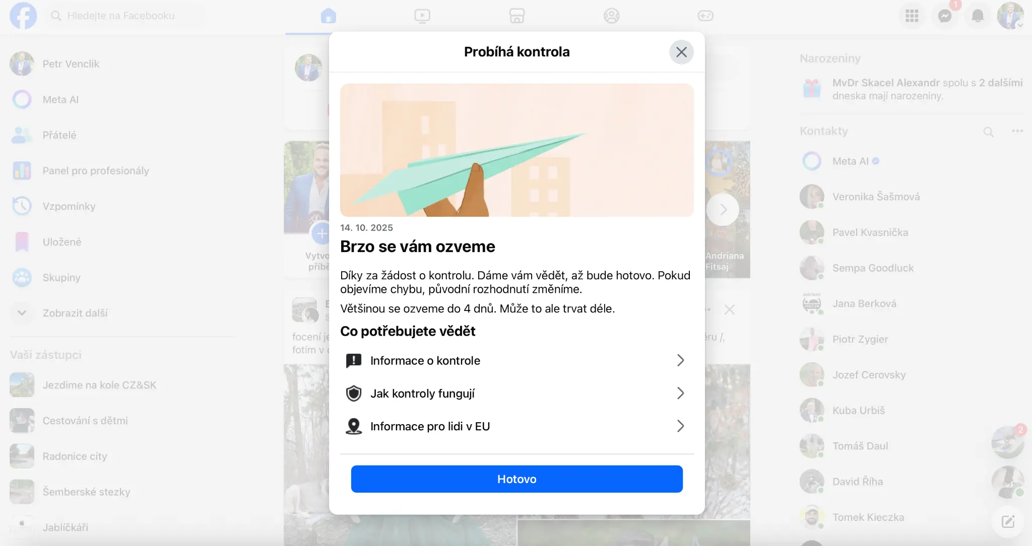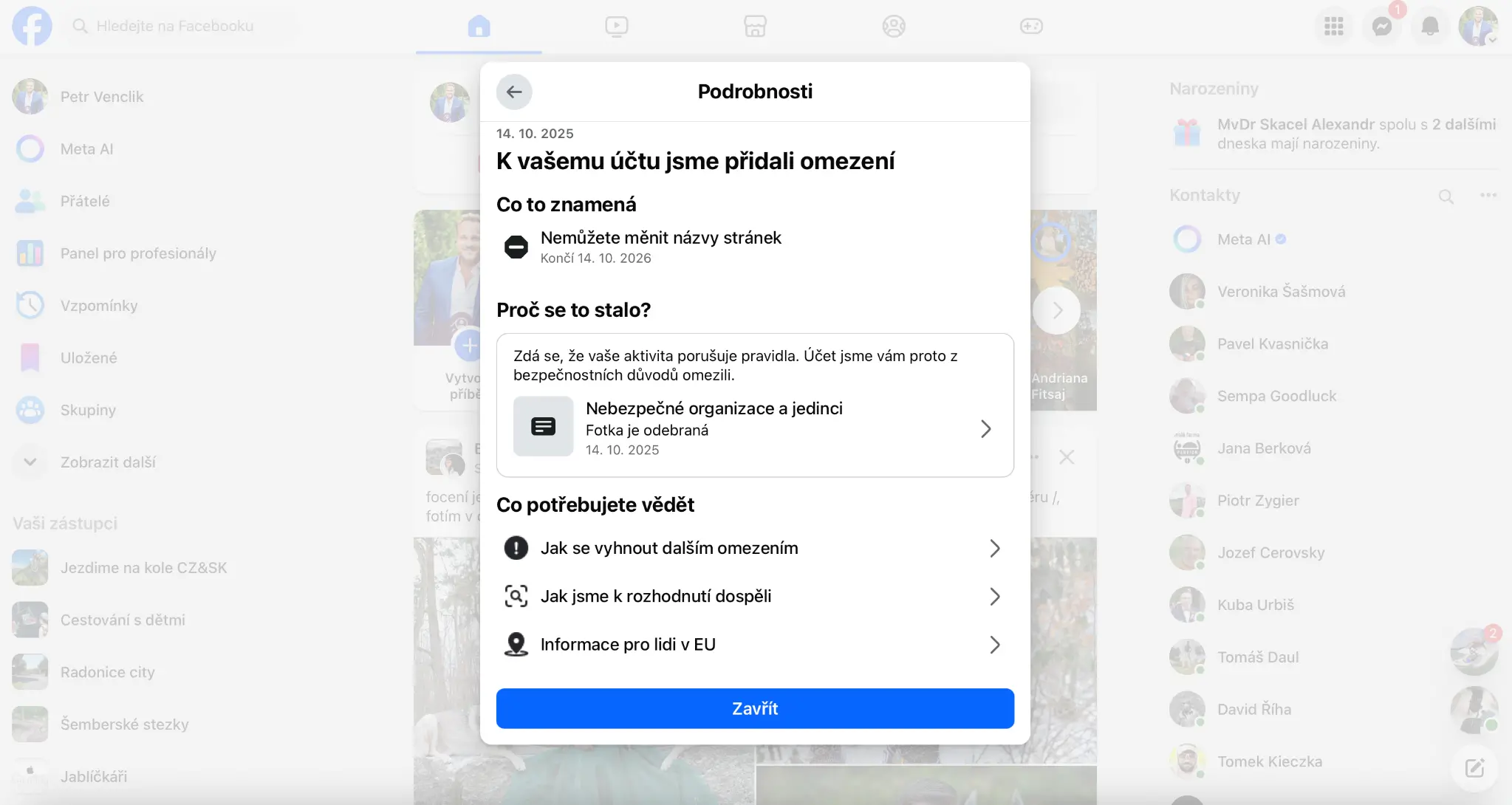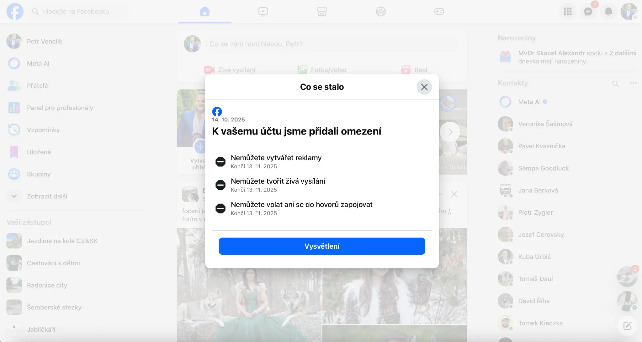 Představ si, že máš účet na Facebooku od roku 2009 jako já. Žádný ban, žádné porušení pravidel, prostě klasický normální člověk, co občas něco sdílí, komentuje, má reálné přátele a reálný život. A pak jednou sdílíš obrázek o politice s textem „Pro všechny naivky!“. Lidi tento post sdílí, má dosah desítek tisíc lidí, lajky atd a pak pod 3 dnech bum. Omezení účtu. Smazaná fotka. Zákaz reklamy, nějaký zákaz vysílání a zákaz hovorů.