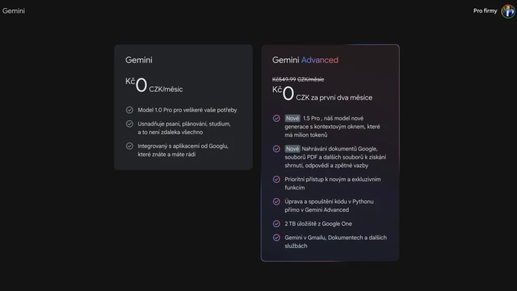 Cena za Gemini Advanced je 549,99 Kč měsíčně. V ceně je zahrnuto: