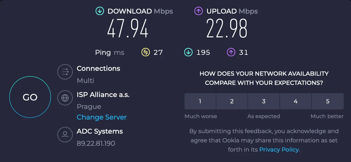 Výsledek? Rychlosti zůstaly většinou pod limitem mého tarifu, takže žádné extrémní zpomalení se nekonalo – ale žádný wow efekt taky ne. U vzdálenějších lokací se sice zvýšila latence, ale připojení bylo stabilní. Na běžné streamování nebo práci úplně v pohodě, 4K stream ale může mít v rušnějších časech občas zaškobrtnutí.