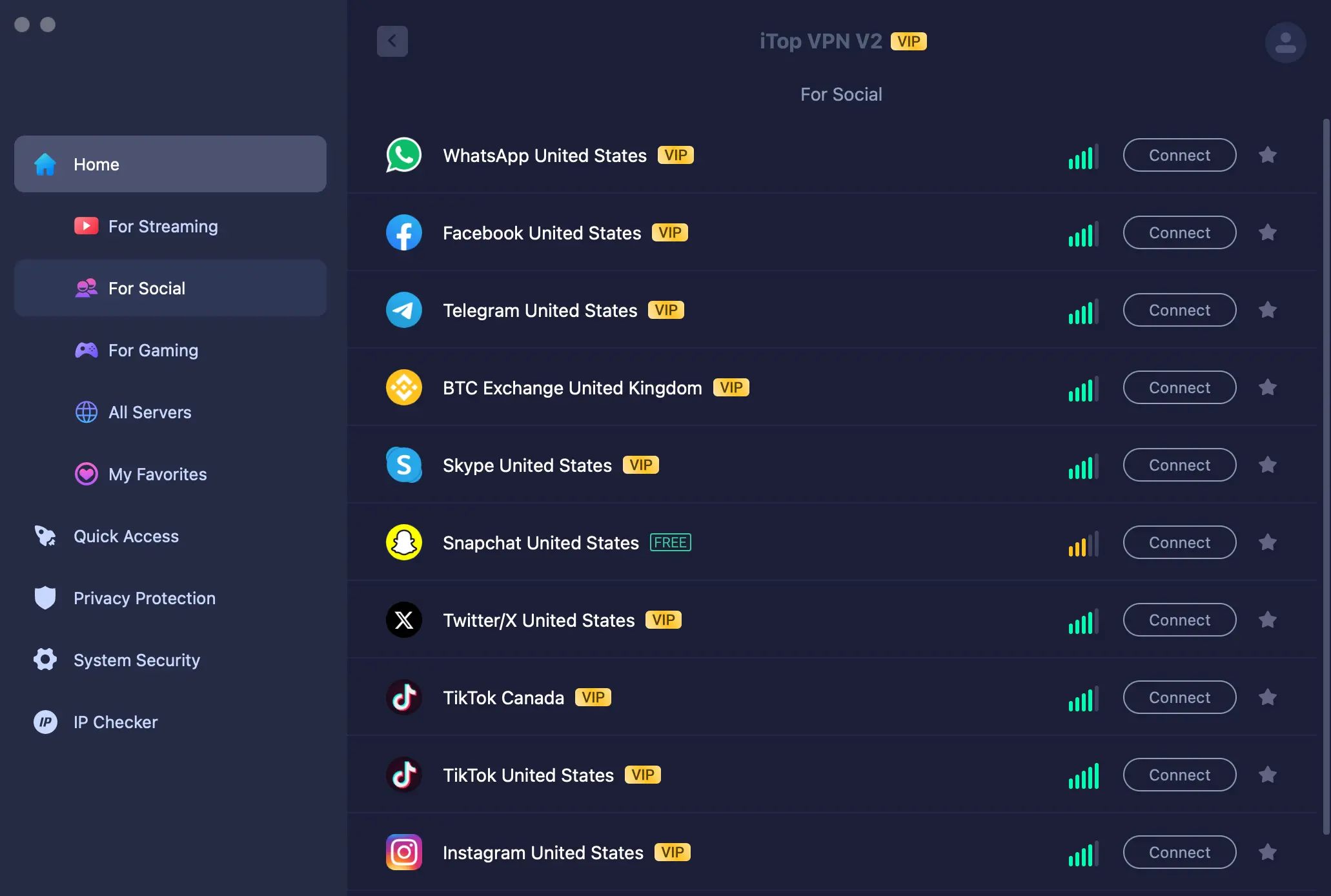 Hned po instalaci aplikace jsem měl jasno. iTop cílí hlavně na začátečníky. Rozhraní je jednoduché, přehledné a nabízí rychlý přístup k různým typům serverů – na stahování, na hraní her, na streamování, nebo třeba na přístup k Telegramu, TikToku nebo Whatsappu.