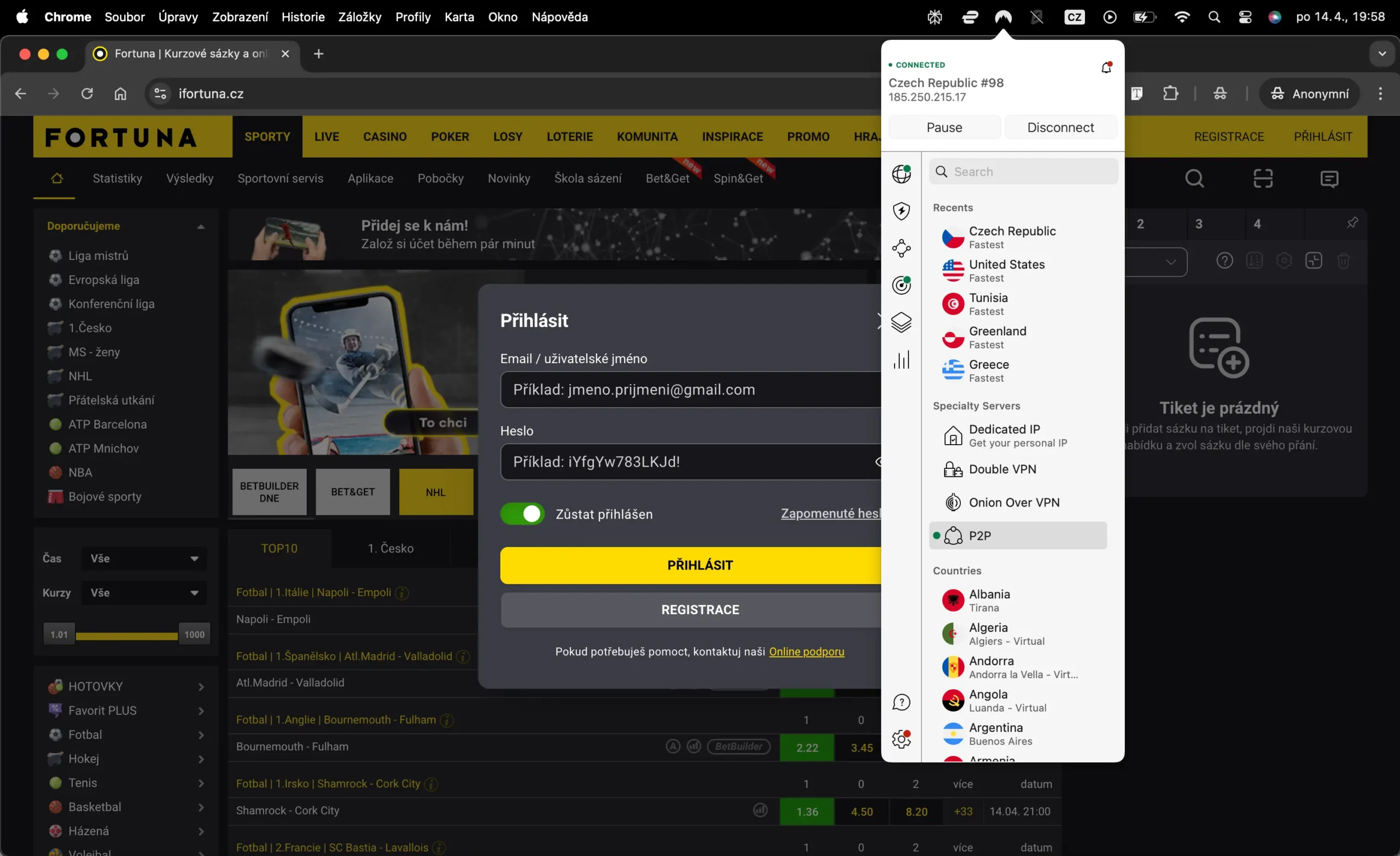 Tohle je naprostý základ – musíte být připojeni přes Česko. Jinak vám Fortuna ukáže známé chybové hlášení: „Přihlášení ze země, ve které se právě nacházíte, není možné.“