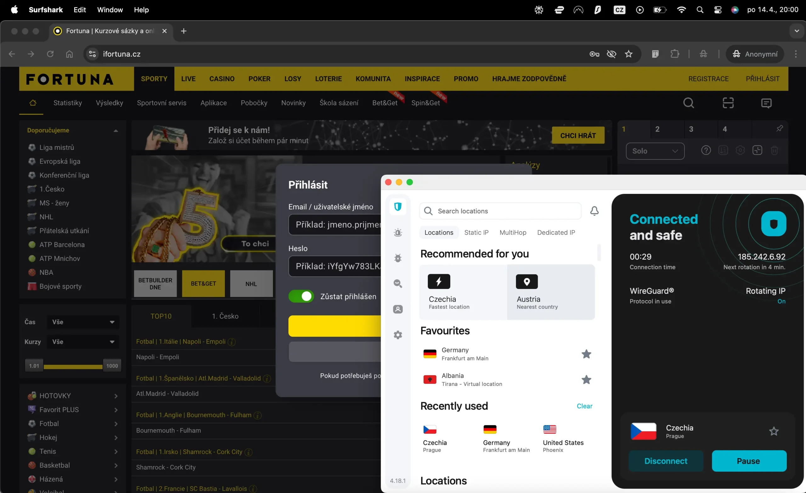 - Může se stát, že Fortuna zkontroluje aktivitu, pokud detekuje připojení z jiných IP adres – ale při mém testování proběhlo vše bez problémů.