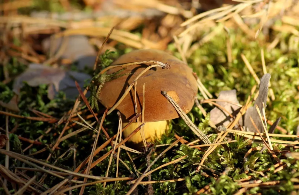 Podubák rostoucí mezi mechem a spadaným jehličím v lese.