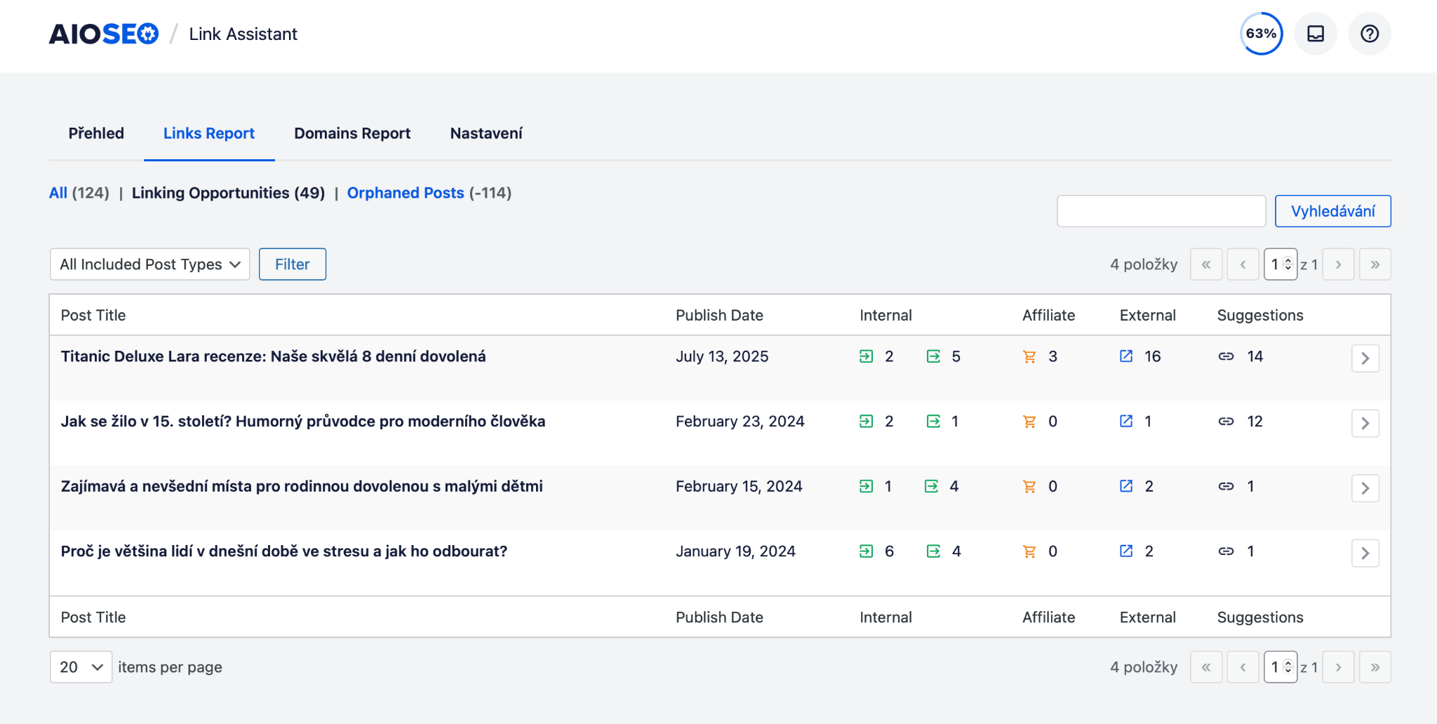 Přímo v administraci WordPressu jdu do menu AIOSEO a kliknu na Link Assistant. Pak se mi otevře přehled mých článků a vedle každého z nich je kolonka se „suggestions“ – návrhy na odkazování. Co je geniální: můžu kliknout na šipku u každého článku a zobrazí se mi konkrétní návrhy.