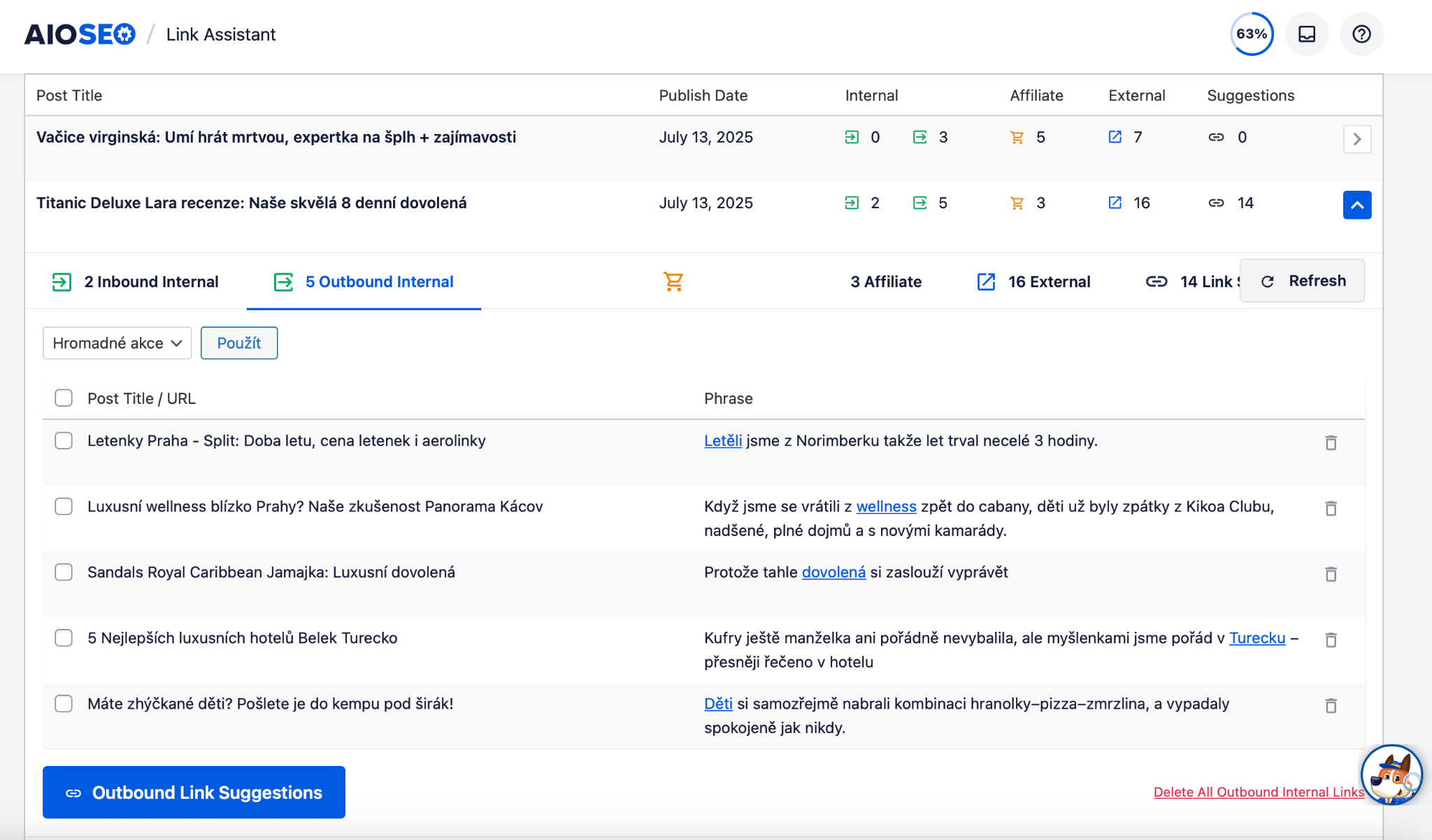 Když jsem začal používat AIOSEO ve veri Pro, jednou z hlavních funkcí, která mě zaujala, byl právě Link Assistant. Funguje jednoduše, ale dělá složité věci. Prohledá celý váš web a navrhne, kde by bylo dobré přidat interní odkazy – buď z jiných článků na ten aktuální (inbound odkazy), nebo naopak z něj na jiné články (outbound odkazy).