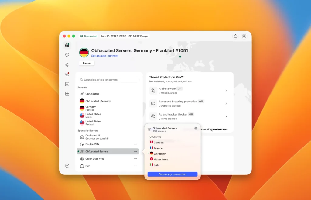 Používáte NordVPN na Macu nebo na iPhone a potřebujete obejít síťové blokace, které běžná VPN nezvládne? Pokud se vám nedaří připojit nebo vám VPN padá v práci, ve městě nebo třeba v zemích, které jsou náročné pro odblokování a přístupu k obsahu, zapněte si obfuskované (tzv. zatemněné) servery. Ty fungují jako maskování, díky nim váš internetový provoz vypadá jako běžné HTTPS spojení a ne jako VPNka.