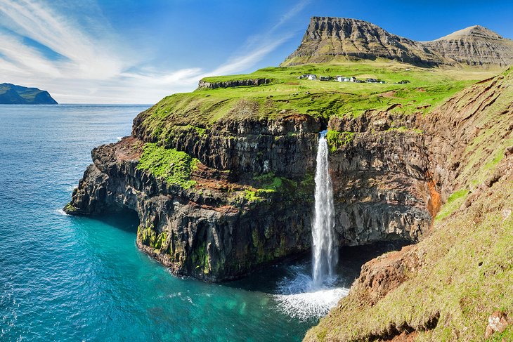 Majestátní vodopád padající z útesu do tyrkysového oceánu na dánském pobřeží, obklopený dramatickou zelenou krajinou a skalnatými horami. Tento nádherný výhled představuje přírodní krásy Dánska, které lákají k objevování a dobrodružstvím v přírodě.