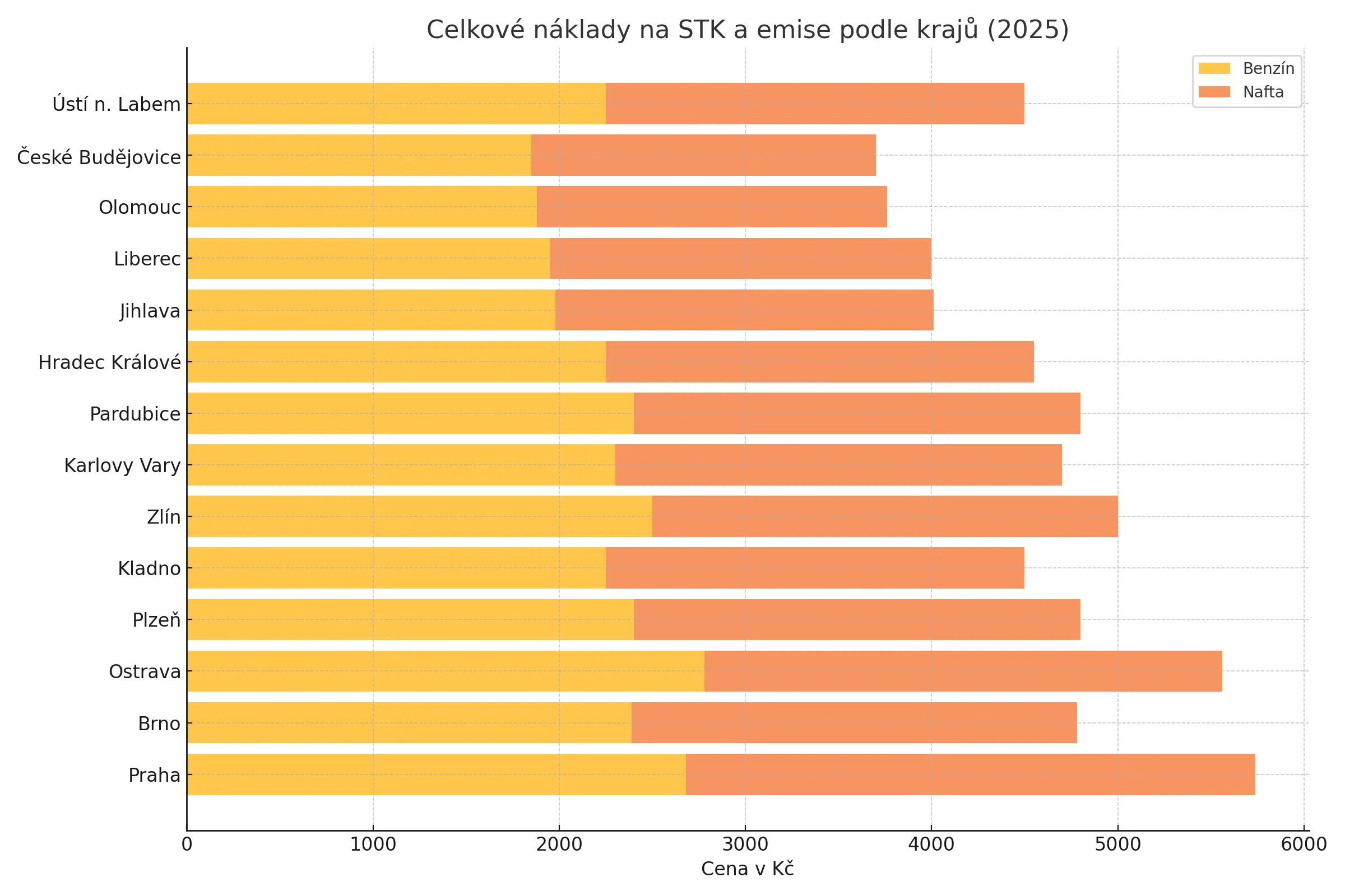 Nejnižší ceny najdete v Olomouckém a Jihočeském kraji. Například v Olomouci zaplatíte za STK 1 090 Kč a za emise 790 Kč, což znamená celkem jen 1 880 Kč. Výrazně levnější jsou i Budějovice nebo Liberec.