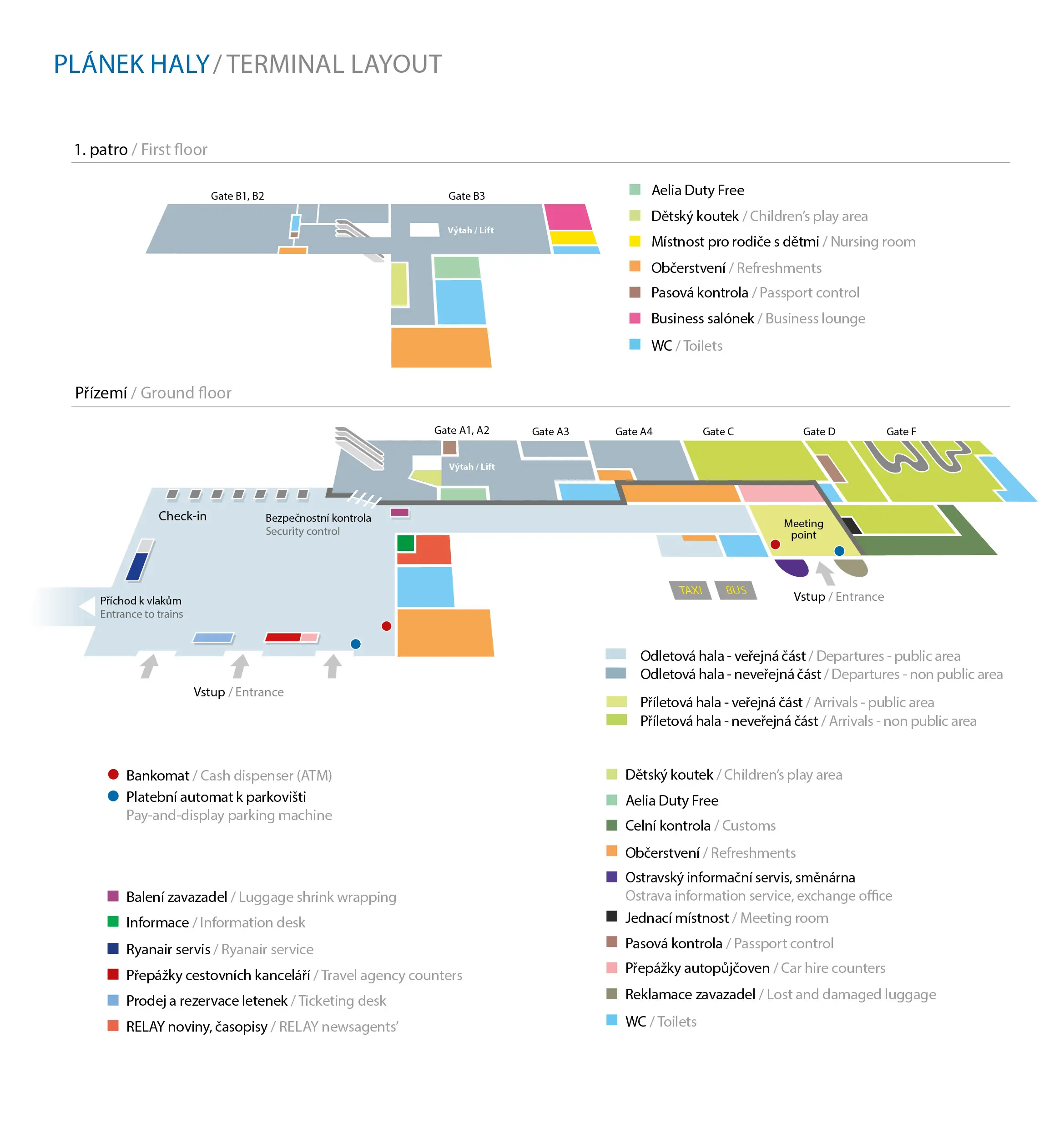 Plánek haly Letiště Leoše Janáčka Ostrava zobrazující rozložení terminálu včetně odbavovací zóny, bran, občerstvení, dětského koutku, duty-free obchodu a dalších služeb na přízemí a prvním patře.