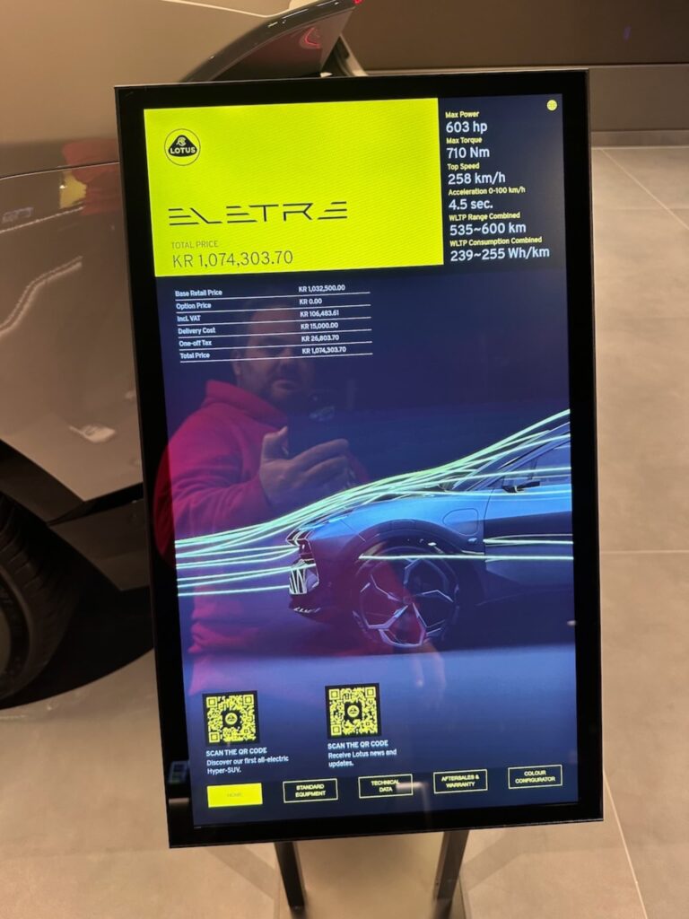 Včera jsem měl v Oslu tu čest spatřit naživo s kamarádem Jakubem SUV Lotus ELETRE R a musím říct, že to byl tedy zážitek, na který jen tak nezapomenu. Ihned jak jsme vstoupili do showroomu Lotusu, vzrušení bylo cítit ve vzduchu. Přítomnost vystavovaného kousku jako korunovační klenot byla vážně ohromující.