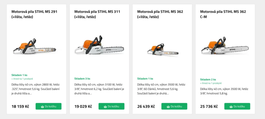 - Obrovský výběr modelů: Od lehkých carvingových pil až po těžké profesionální stroje pro kácení a řezání extrémních průměrů.