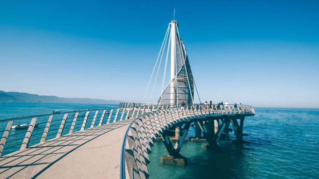 Moderní architektonický most v Puerto Vallarta nad oceánem.