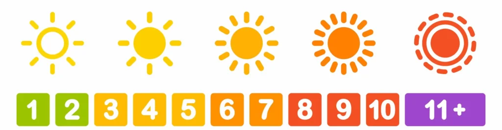 UV index je standardizované měření síly ultrafialového záření na určitém místě a v daném čase. Škála se pohybuje mezi 0-11+, přičemž vyšší hodnoty značí větší riziko spálení a poškození kůže: