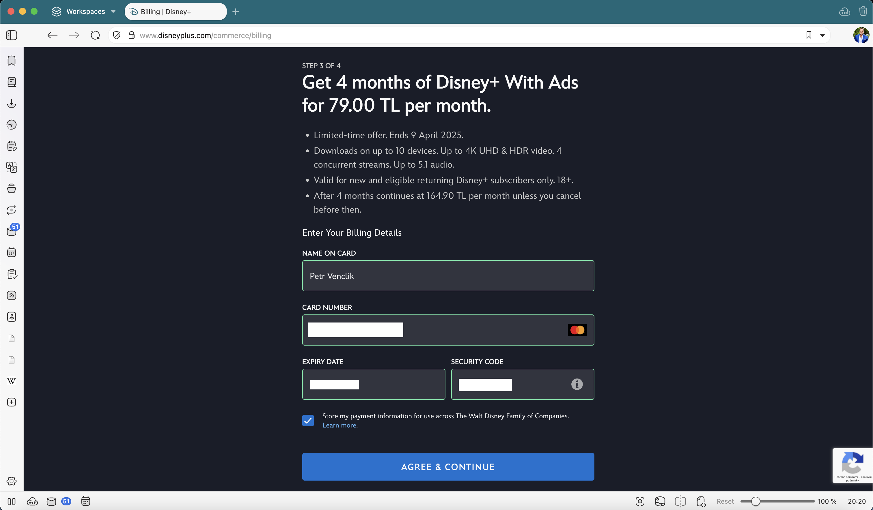 - Zaregistrujte se na Disney+ přes daný server, uveďte požadovanou zemi a zaplaťte místní cenu.