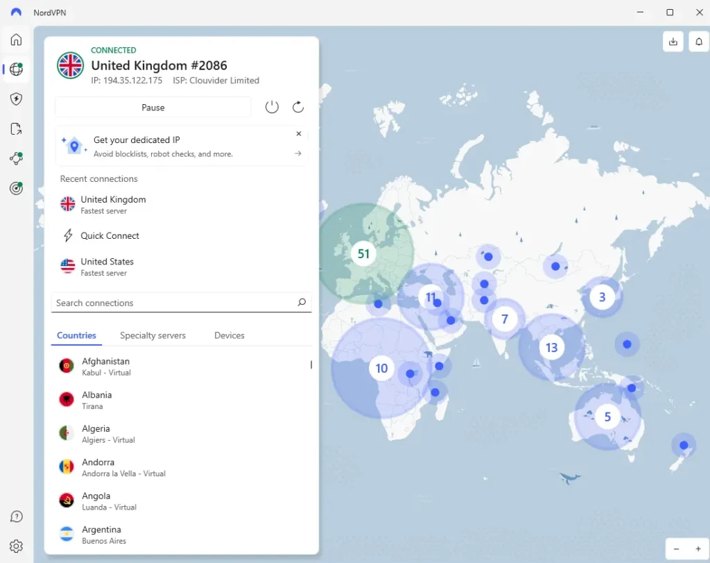 NordVPN se může pochlubit rozsáhlou síťí více než 8900+ serverů rozložených ve více než 129+ zemích po celém světě a 165 lokalitách! (aktualizováno 13.2.2026). Víceméně má stovky serverů v zemích od Serverní Ameriky, přes Evropu po Asii až Afriku.