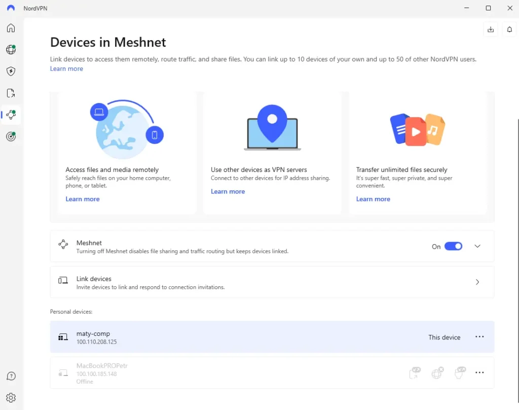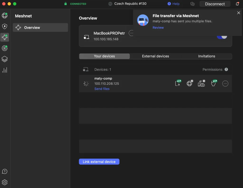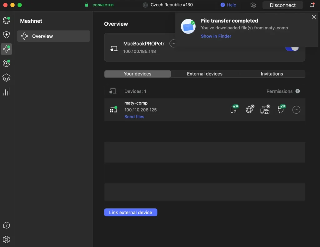 - Meschnet: Tohle je věc, kterou ocení hlavně ti, kdo chtějí propojit víc zařízení mezi sebou, třeba počítač doma, notebook v práci a mobil na cestách. Meshnet ti umožní vytvořit vlastní „mini-internet“ tzv. bezpečnou síť mezi tvými zařízeními, která si pak můžou navzájem posílat soubory, sdílet obsah nebo i šifrovaně přistupovat na web.