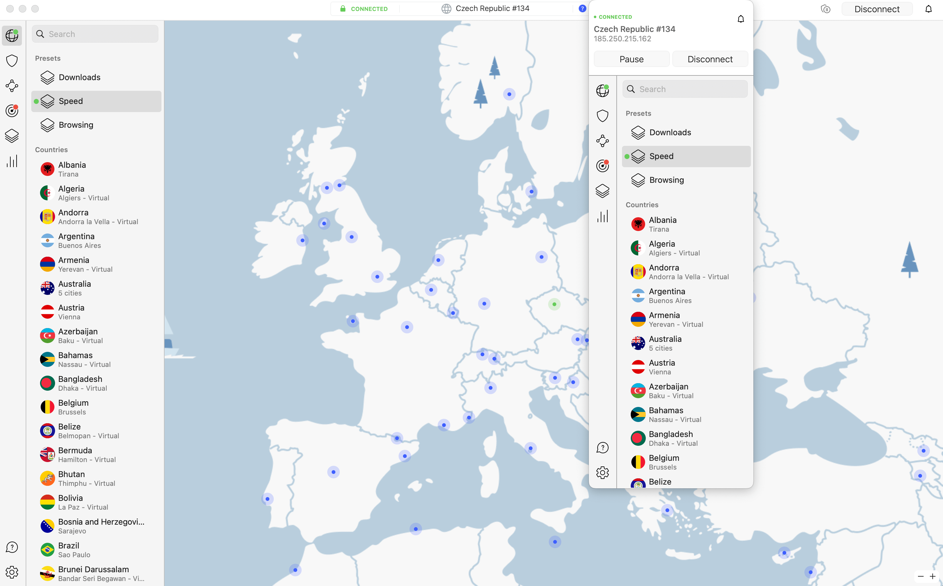 Takto globální pokrytí zajišťuje, že uživatelé mohou najít spolehlivý server téměř v jakékoliv zemi na světě. Rychlost serverů pak činí úctyhodných 6730+ Mbps.