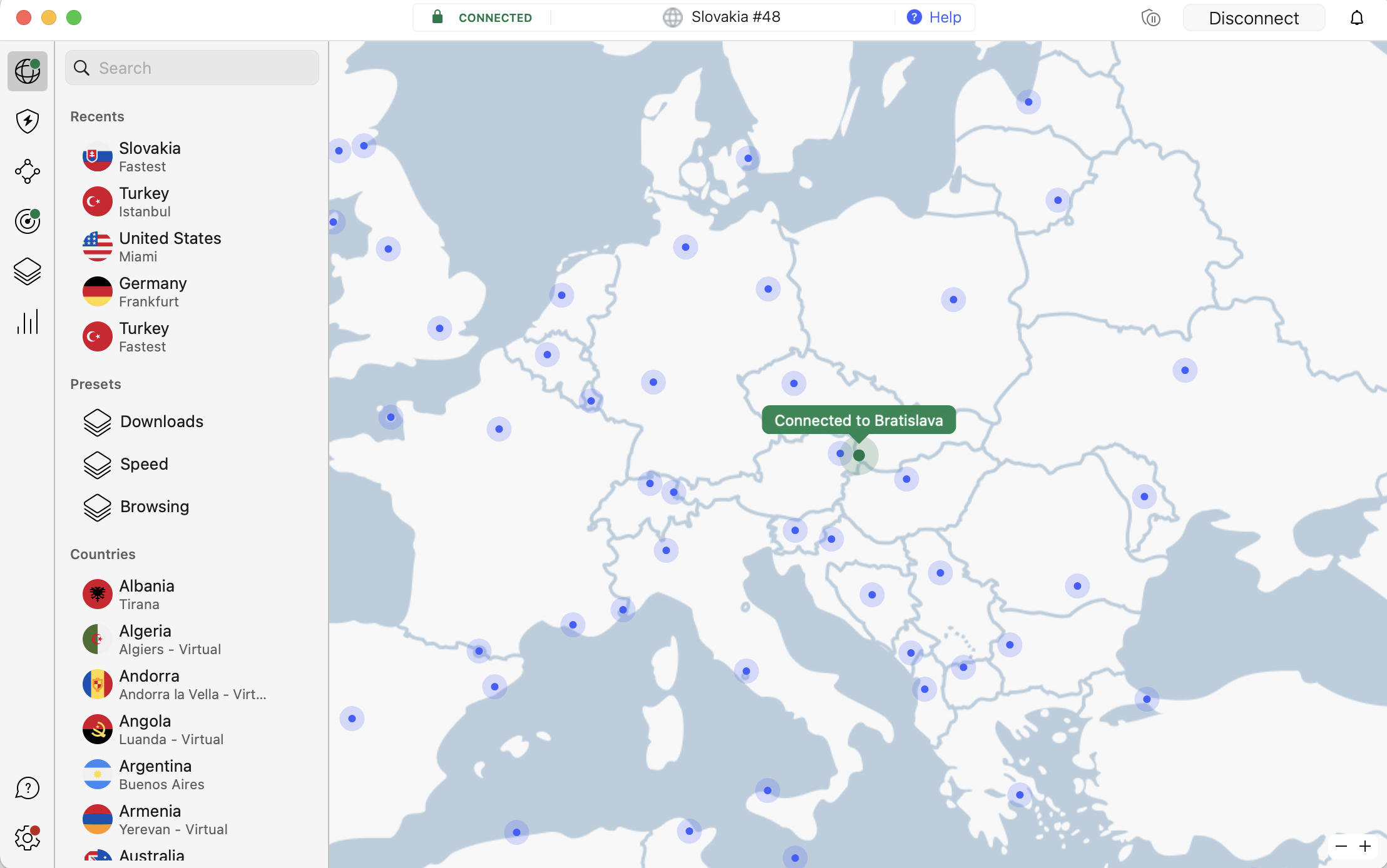 NordVPN připojeno k serveru na Slovensku HUB Bratislava