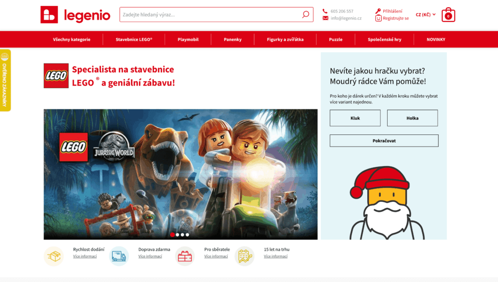 Web Legenio.cz s výběrem LEGO® stavebnic a bannerem s tématem LEGO® Jurassic World, nástrojem pro výběr dárků a informacemi o rychlosti doručení a dopravě zdarma.