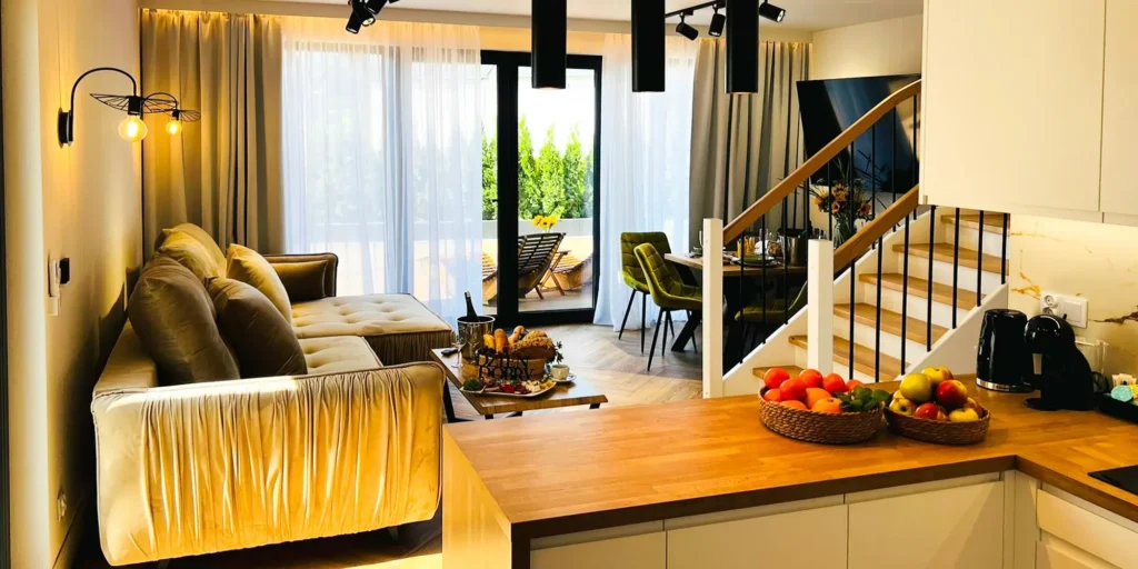 Představte si, že přijedete k plně vybavenému domku jako z katalogu. V Olivina Parku na vás čekají moderní interiéry, které si ale pořád zachovávají útulnou atmosféru. Hned jsem se cítila jako doma – možná i líp, protože doma nemáme tak krásnou zahradu a dvě terasy.