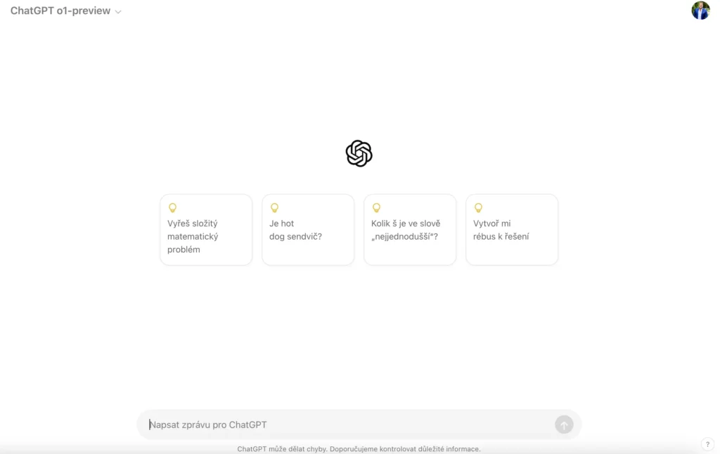 Snímek obrazovky zobrazující rozhraní ChatGPT o1-preview s několika návrhy dotazů nebo úkolů pro umělou inteligenci. Mezi návrhy patří otázky jako "Vyřeš složitý matematický problém," "Je hot dog sendvič?" nebo úkoly jako "Vytvoř mi rébus k řešení." Uprostřed je logo ChatGPT a v dolní části obrazovky je pole pro napsání zprávy pro ChatGPT.