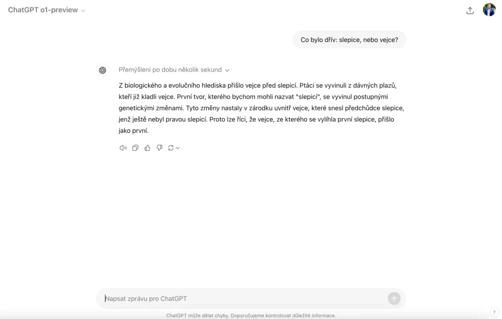 Snímek obrazovky zobrazující odpověď ChatGPT na otázku "Co bylo dřív: slepice, nebo vejce?". ChatGPT vysvětluje z biologického a evolučního hlediska, že vejce přišlo před slepicí. Uvádí, že ptáci se vyvinuli z dávných plazů, kteří kladli vejce. První tvor, kterého bychom mohli nazvat "slepicí," se vyvinul postupnými genetickými změnami a vznikl z vejce, které snesl předchůdce slepice. Proto vejce přišlo jako první.