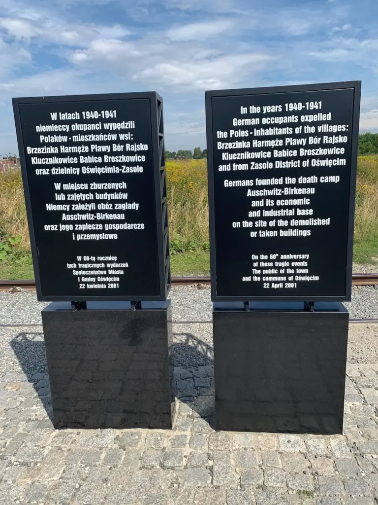 Fotografie zachycuje dvě pamětní desky v Osvětimi (Auschwitz), které připomínají vyhnání polských obyvatel z vesnic Brzezinka, Harmęże, Pławy, Bór, Rajsko, Klucznikiowice, Babice, Broszkowice a z osady Zasole v Osvětimi německými okupanty v letech 1940-1941. Text na deskách uvádí, že na místě zbořených nebo zabraných budov Němci založili vyhlazovací tábor Auschwitz-Birkenau a jeho hospodářské a průmyslové zázemí. Desky byly odhaleny k 60. výročí těchto tragických událostí veřejností města a obce Osvětim dne 22. dubna 2001.