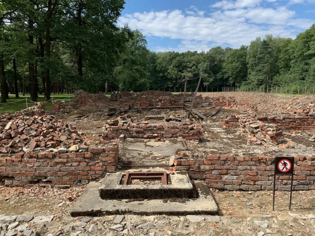 Fotografie zobrazuje trosky plynových komor v koncentračním táboře Osvětim (Auschwitz). Zbytky cihelných zdí a rozbořené struktury připomínají místo, kde byly páchány masové vraždy během holocaustu. Okolní zeleň kontrastuje s devastací a smutnou historií tohoto místa. Pohled na tyto trosky evokuje silné emoce a nutí k zamyšlení nad hrůzami, které se zde odehrávaly.