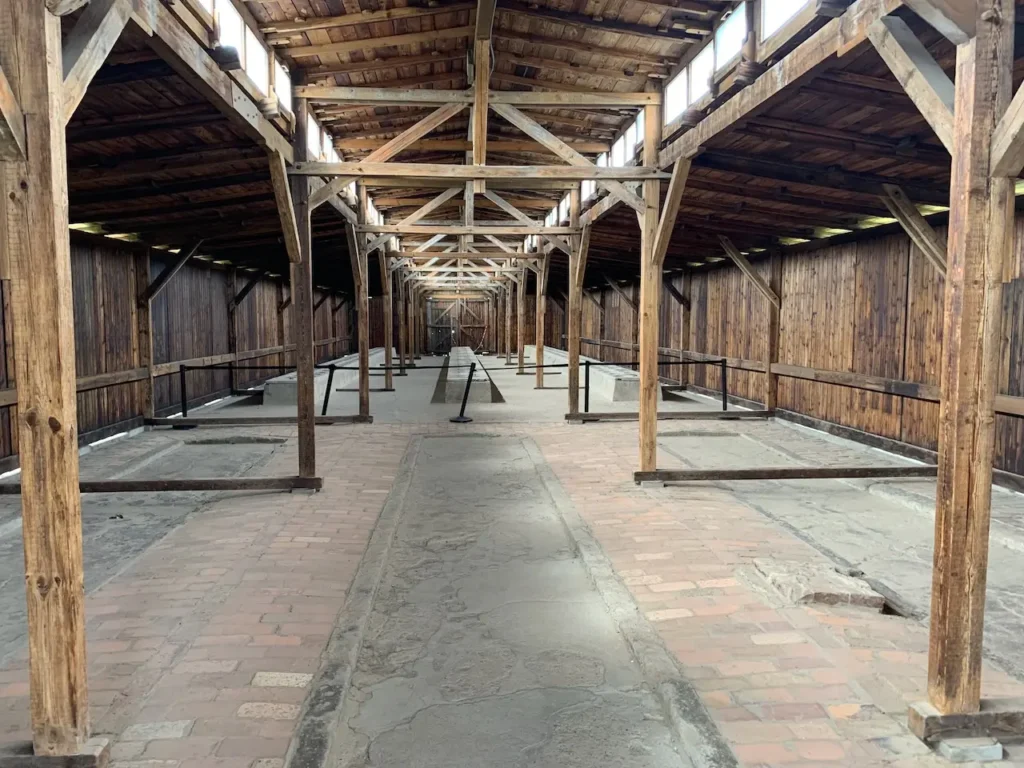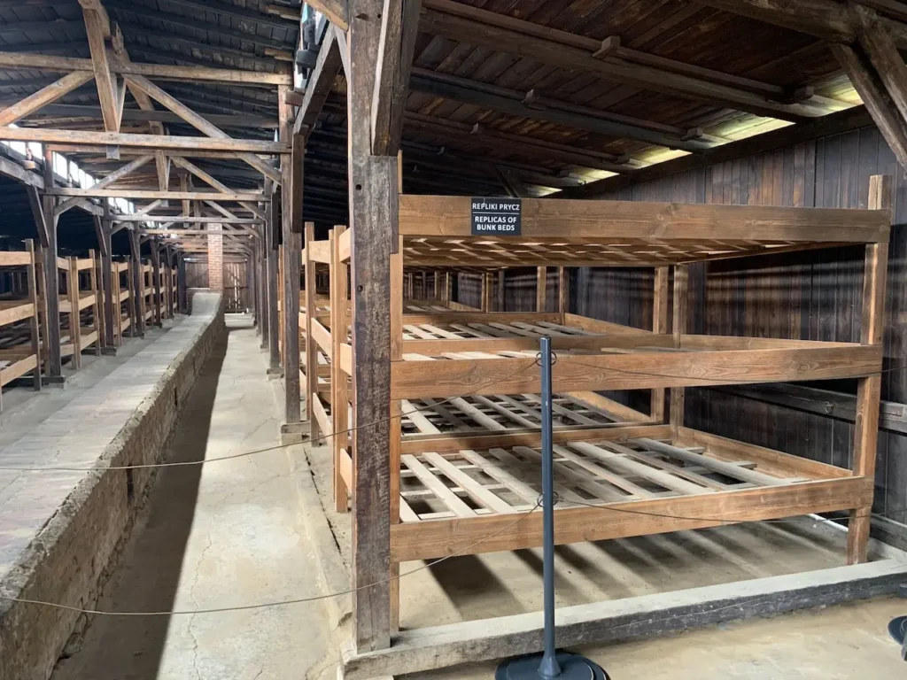 Fotografie zobrazuje interiér dřevěných baráků v koncentračním táboře Osvětim (Auschwitz). V popředí jsou repliky dřevěných paland, které sloužily jako ubytování pro vězně. Prostor je jednoduchý a strohý, s robustními dřevěnými trámy podpírajícími strop. Tato část tábora ilustruje těžké podmínky, ve kterých byli vězni nuceni přežívat během druhé světové války.