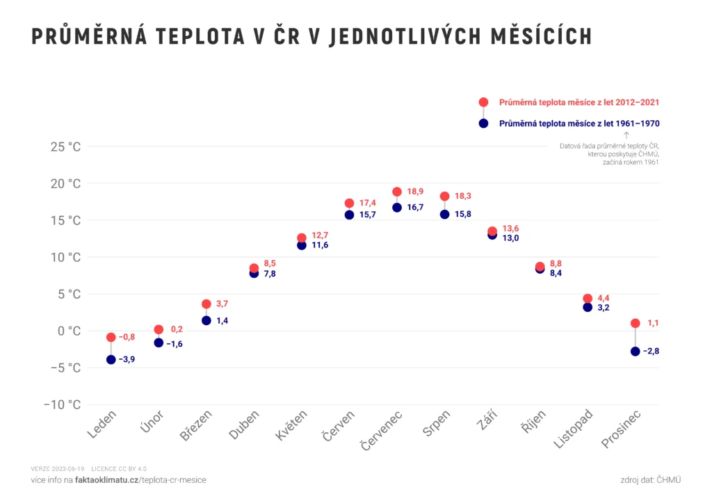 Průměrná teplota v ČR v jednotlivých měsících 19612021 Zdroj obrázku Fakta o klimatu