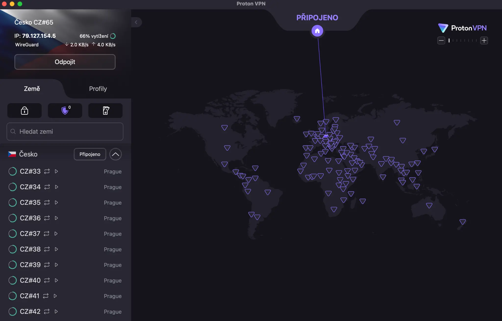 ProtonVPN připojení na server v Česku – seznam dostupných serverů v Praze v desktopové aplikaci