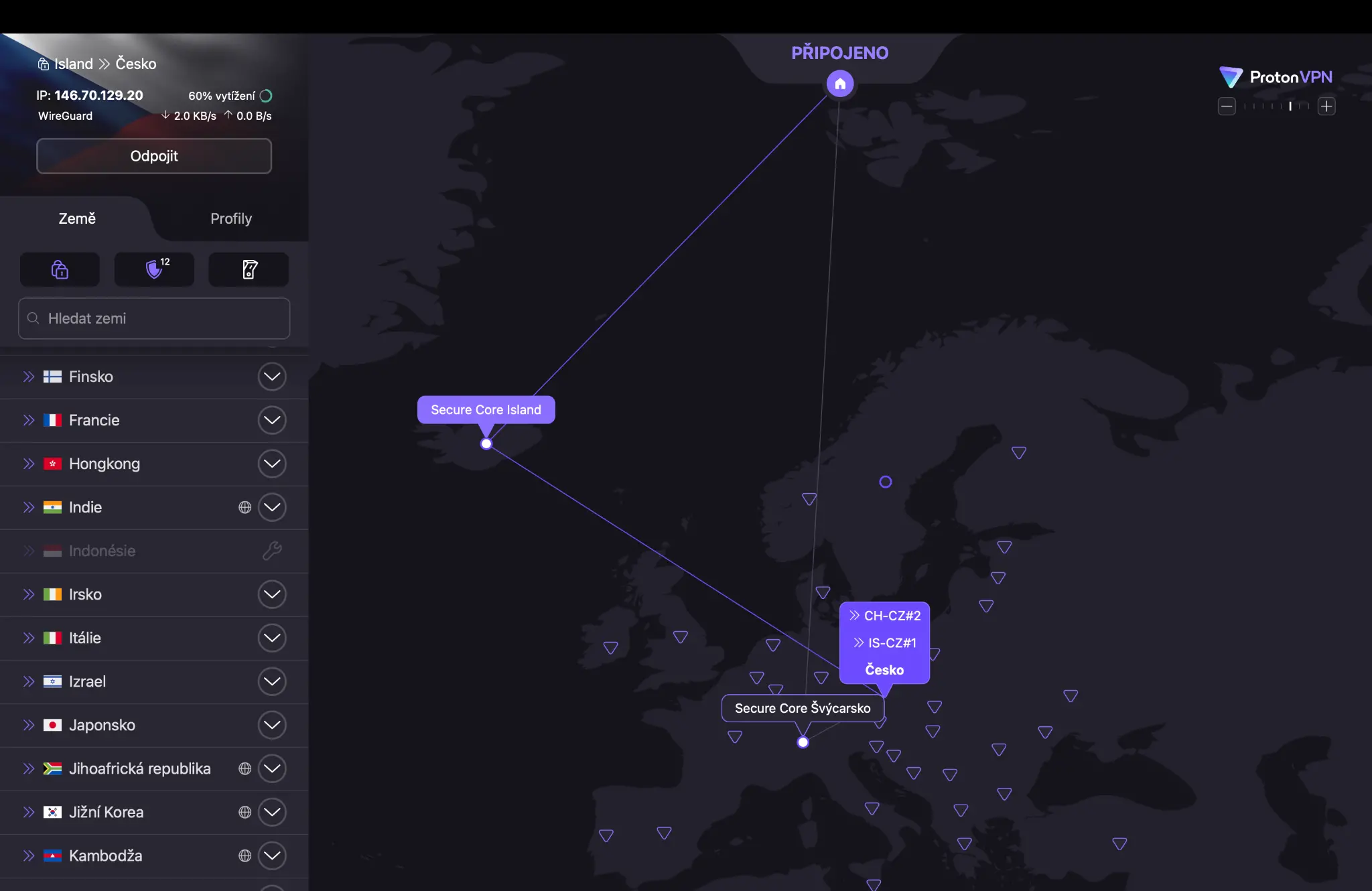 ProtonVPN Secure Core connection map showing double-hop routing from Iceland and Switzerland to the Czech Republic