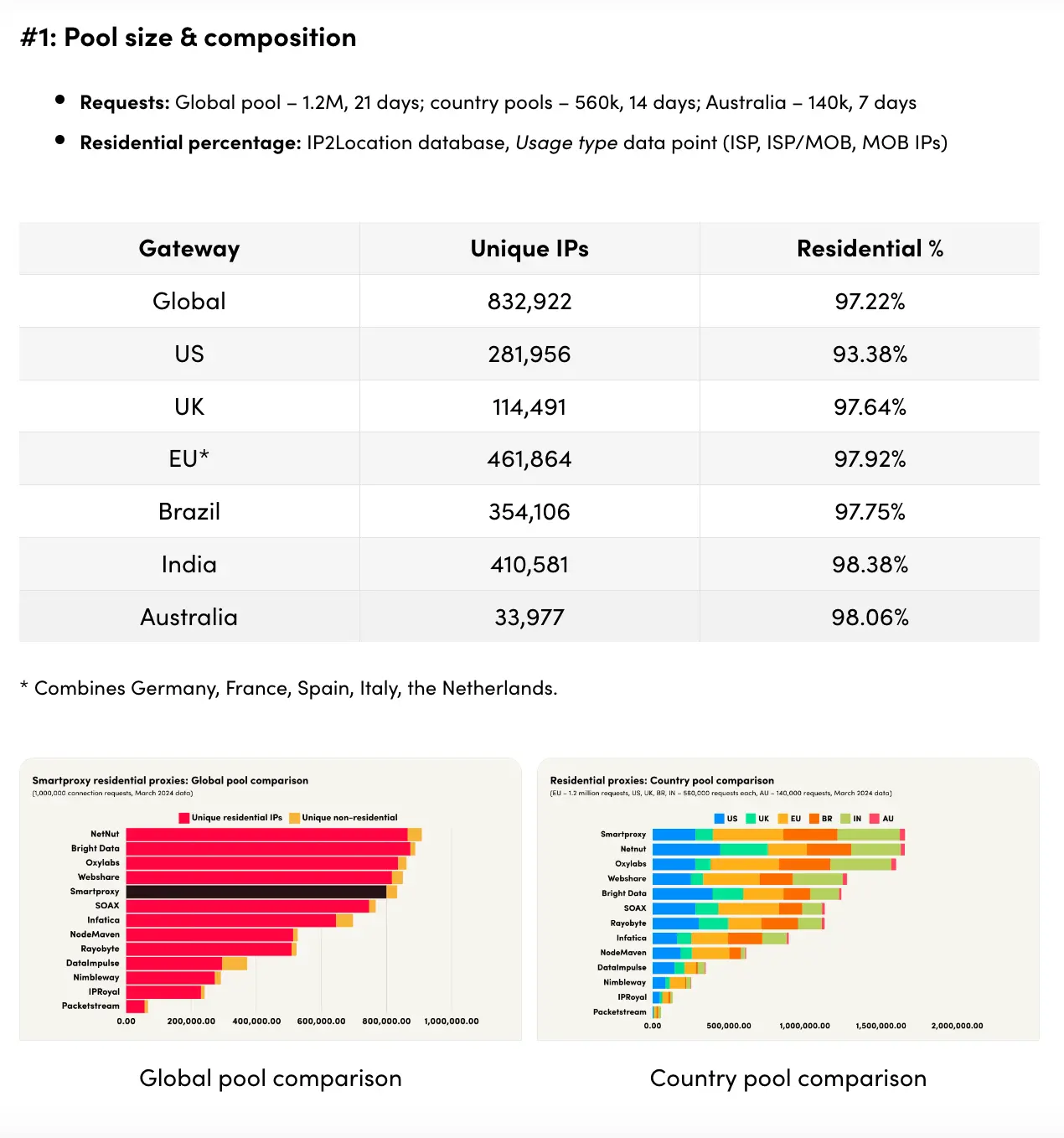 Tabulka velikosti a složení proxy poolu Smartproxy, zobrazující unikátní IP adresy a procento rezidenčních proxy podle regionu, včetně grafů porovnání globálních a regionálních poolů.