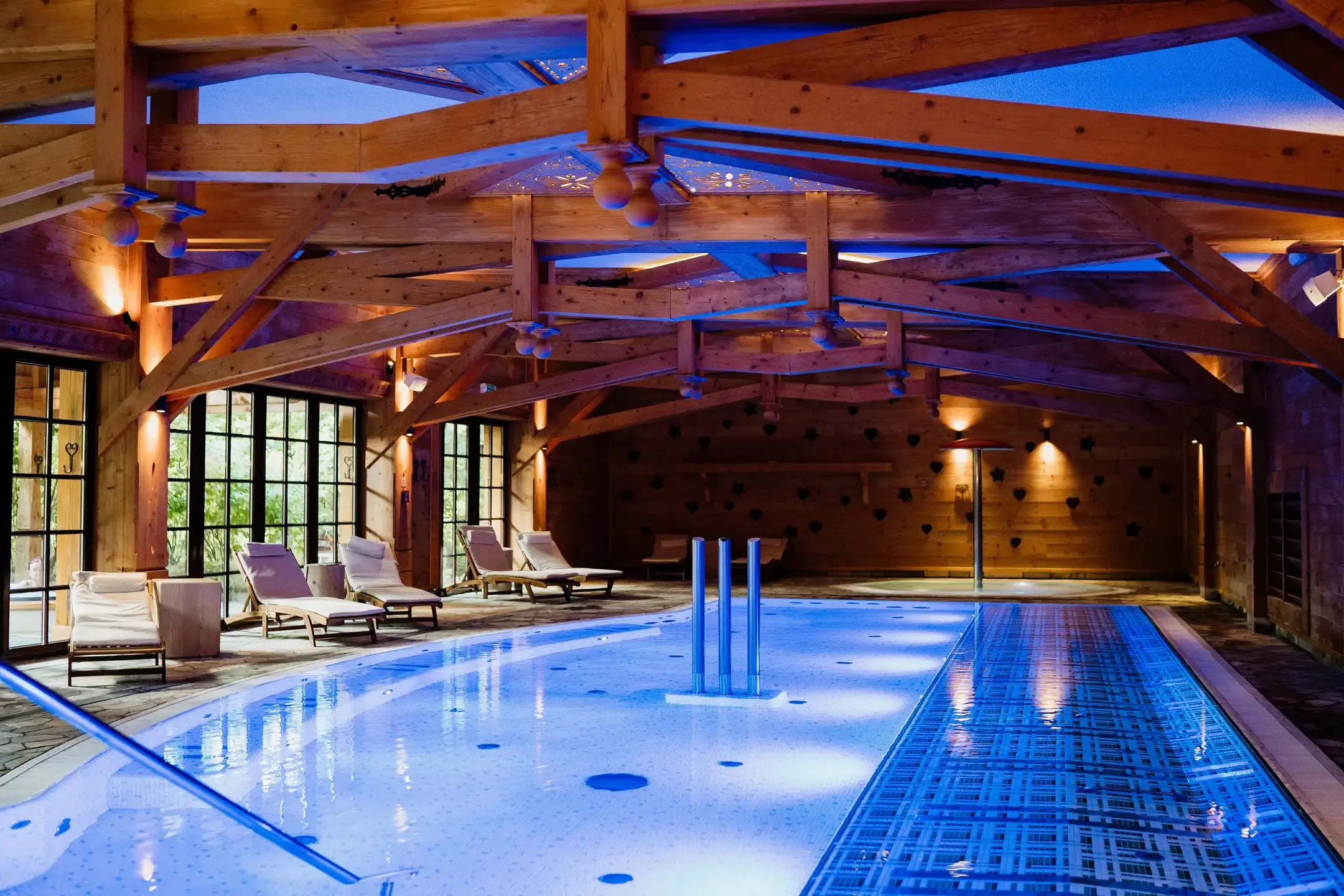 Vnitřní bazén s dřevěným stropem má úplně jinou atmosféru než běžná hotelová koupaliště – je to spíš takové chrámové ticho, kde vás nikdo neruší, jen voda a klid. K tomu dvě venkovní vířivky, kde si klidně sedíte ve sněhu a přitom vás hřeje voda i horký vzduch kolem.