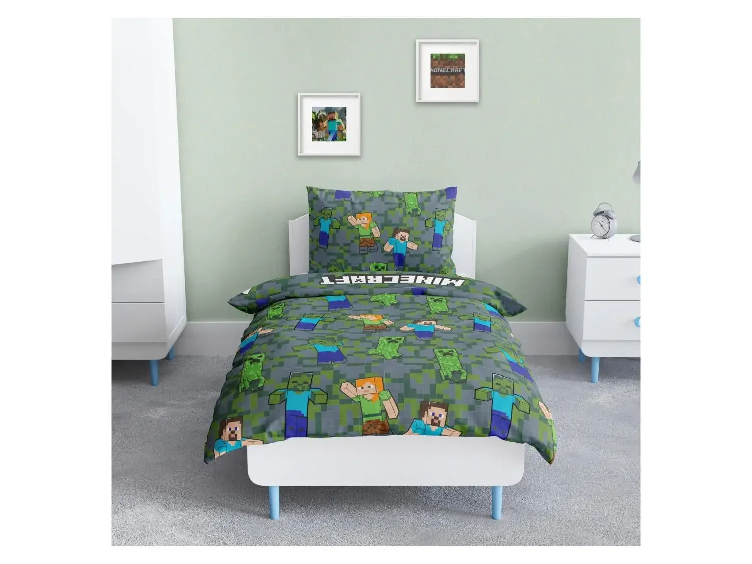 • Ložní povlečení v odstínech zelené a navy modré krásně funguje jako základ – když zvolíš neutrální nábytek (bílý, šedý, dřevěný), motiv Minecraftu zůstane dominantní, ale nebude „řvát“.