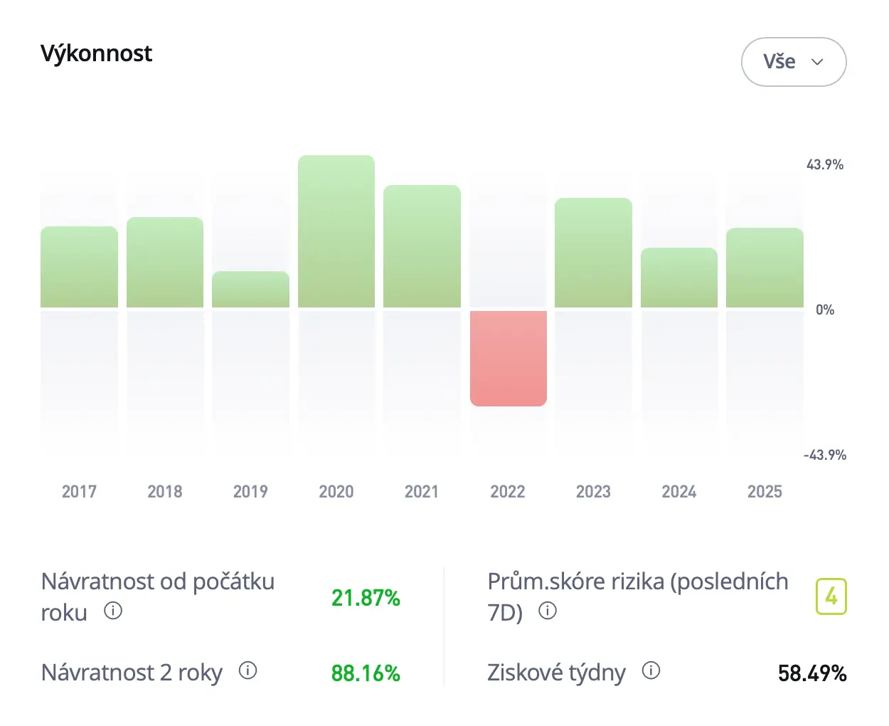 • Klíčové metriky: Risk Score: 5. Návratnost za dva roky: přes 43 %.